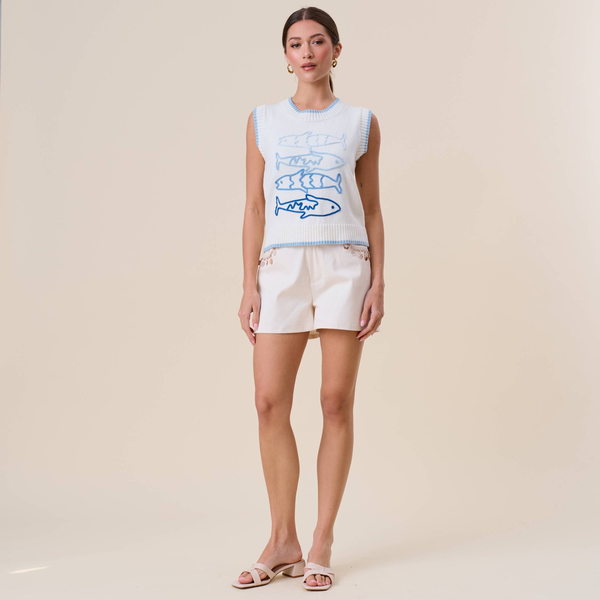 Dive into playful style with this Sardine Embroidered Sleeveless Sweater, where quirky charm meets everyday comfort. Featuring an adorable fish knit design, this sleeveless vest pairs perfectly with your favorite shorts for a look that's equal parts whimsy and sophistication.