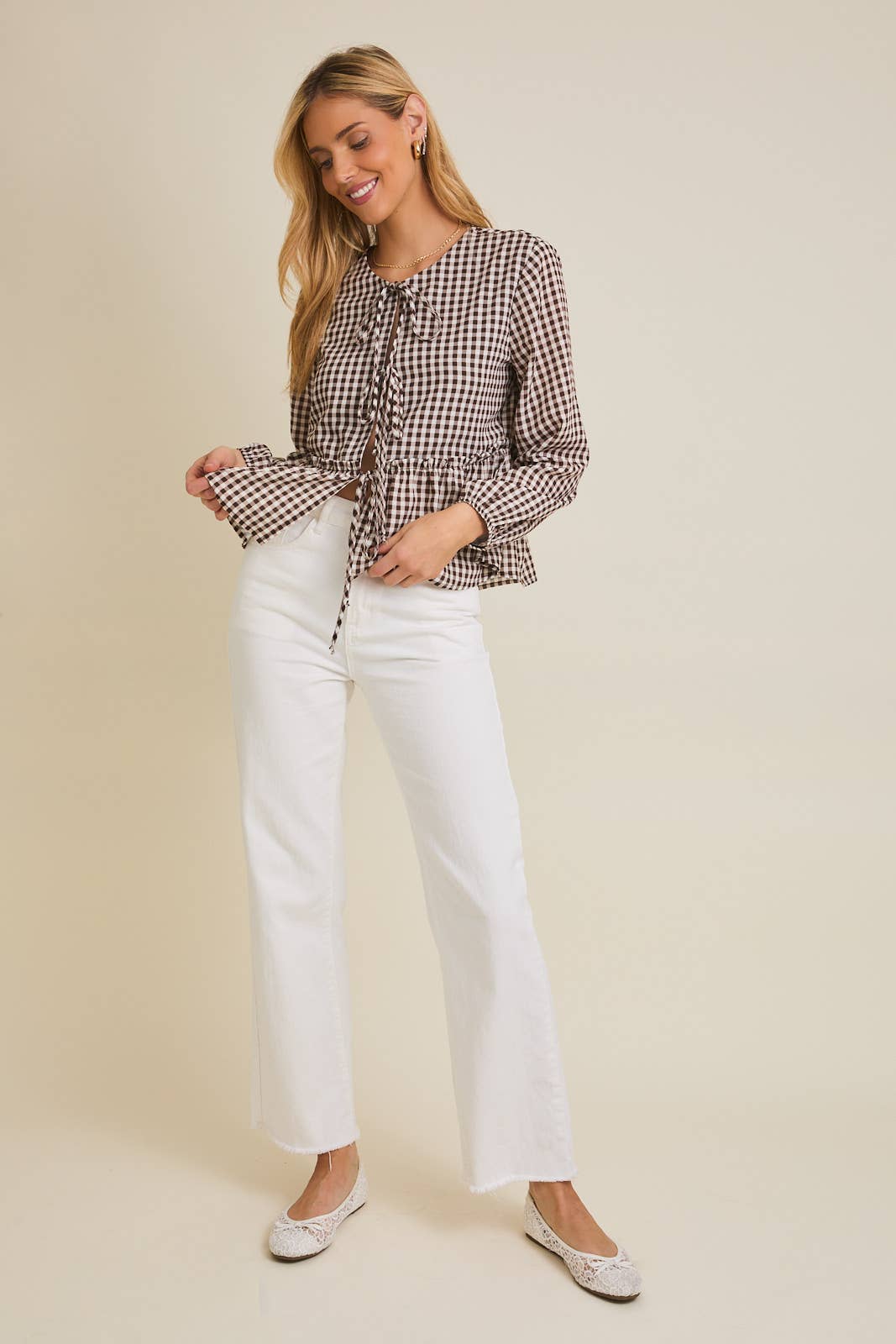 Add a dash of charm to your wardrobe with the Check Print Triple Bow Front Top. This playful design features three adorable bows that bring sweet, flirty flair to your look. The classic check print adds timeless appeal, perfect for casual days or brunch with friends.