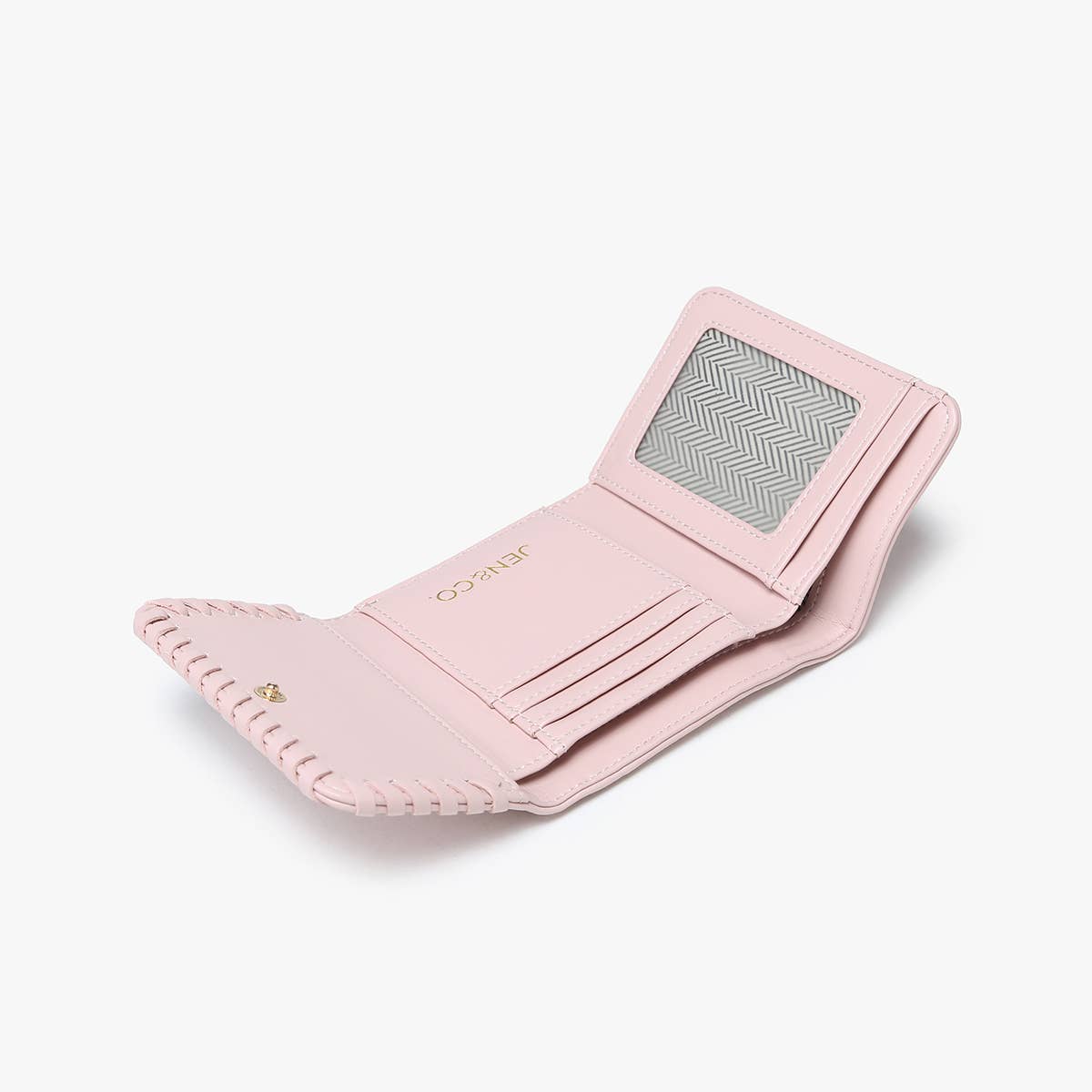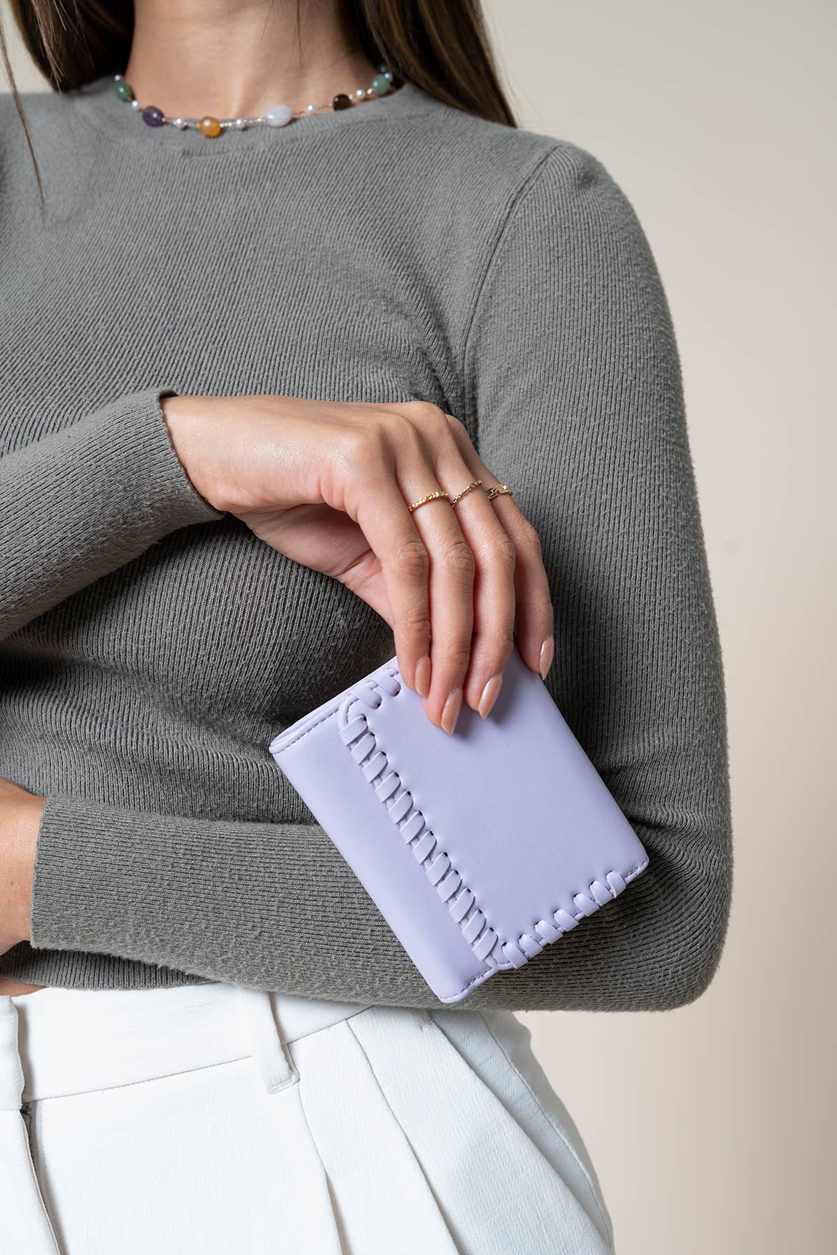 This tri-fold wallet offers both style and functionality with its whipstitch detailing and practical interior featuring an ID holder and card slots, all crafted from vegan leather for a cruelty-free accessory option.