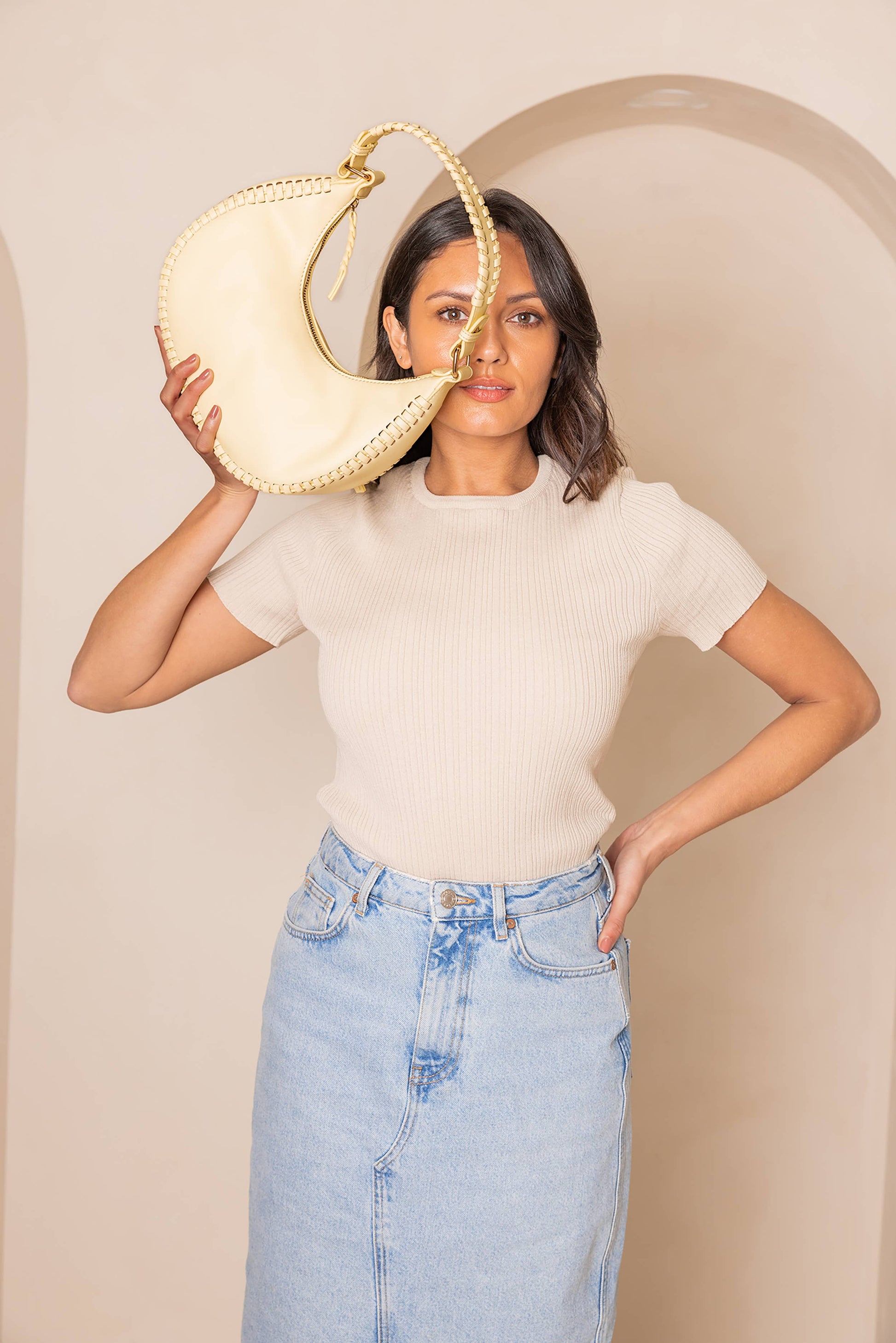 A perfect everyday bag, the Aria Whipstitch Crescent Shoulder Bag effortlessly blends fashion and functionality. Its sleek, crescent shape and stylish whipstitch detailing make it an ideal accessory for all your spring and summer adventures, offering both practicality and chic flair.