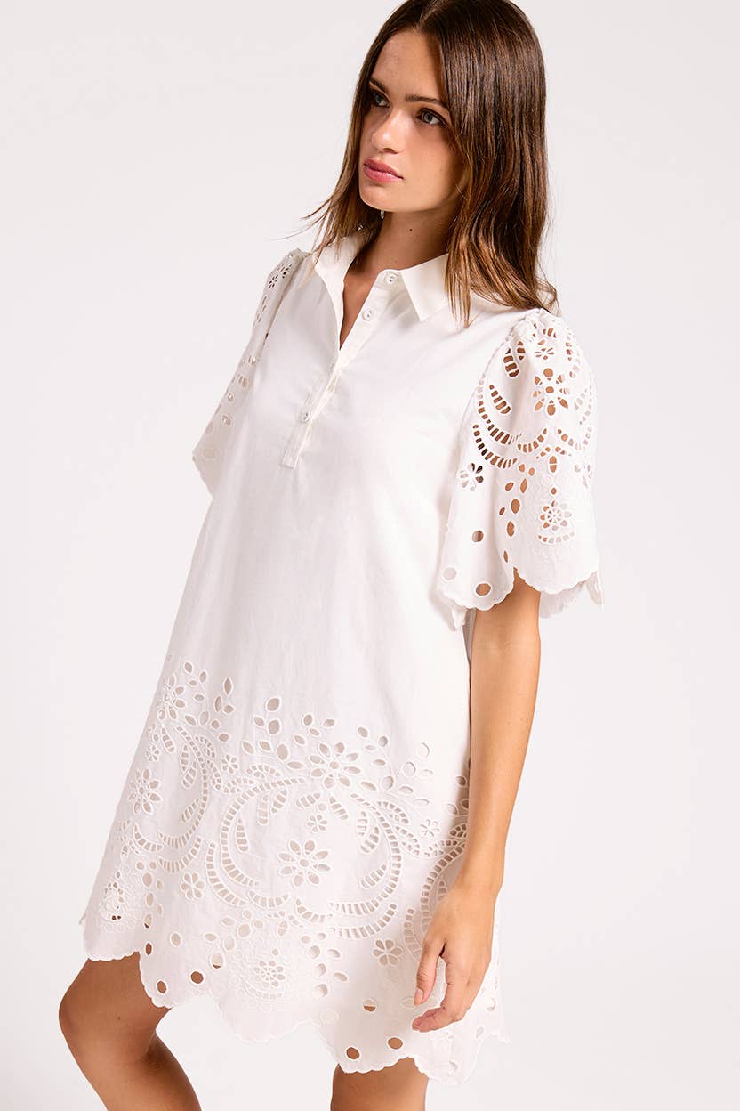Elevate your wardrobe with this charming scallop embroidered mini dress—where sophistication meets fun. The delicate scallop detailing adds a touch of whimsy to a timeless silhouette, making it perfect for brunch dates, casual outings, or whenever you want to feel effortlessly put-together. Flirty, feminine, and undeniably chic, this dress is your new go-to for looking polished without trying too hard.